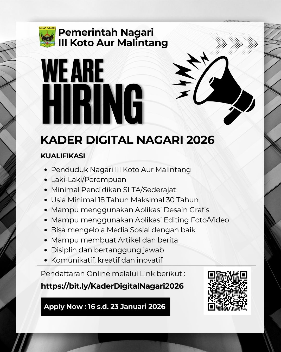 Pemerintah Nagari III Koto Aur Malintang kembali membuka kesempatan bagi anak-anak nagari yang memiliki minat serta kemampuan dibidang digitalisasi untuk bergabung bersama Pemerintah Nagari III Koto Aur Malintang dalam rangka mewujudkan Pemerintah Nagari yang Informatif, Transparan dan Akuntabel.